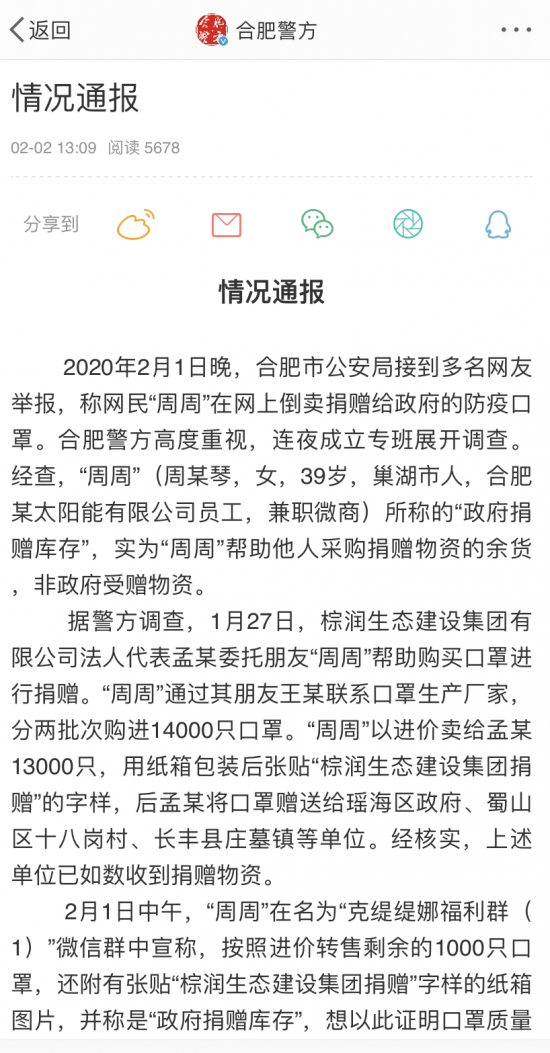 中安在线、中安新闻客户端讯 2020年2月1日晚,合肥市公安局接到多名网友举报,称网民“周周”在网上倒卖捐赠给政府的防疫口罩。合肥警方高度重视,连夜成立专班展开调查。经查,“周周”(周某琴,女,39岁,巢湖市人,合肥某太阳能有限公司员工,兼职微商)所称的“政府捐赠库存”,实为“周周”帮助他人采购捐赠物资的余货,非政府受赠物资。