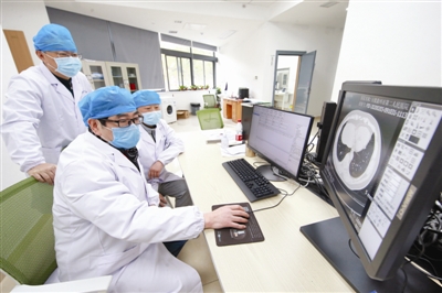 图为2月3日,在市第二人民医院影像诊断室,专家组在观看发热患者的胸部CT,进行会诊。