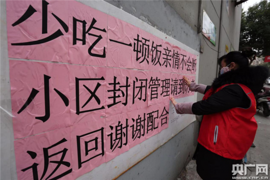 马鞍山一社区工作人员张贴疫情宣传语(央广网发 马鞍山区委宣传部供图)