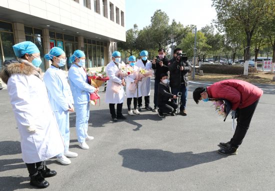 图为: 2月10日,治愈出院的患者向医护人员深鞠躬表达感谢。沈果 摄