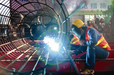 滁宁城际铁路二期建设现场,电焊工在钢筋加工区对钢筋笼进行焊接作业。 记者卢志永摄
