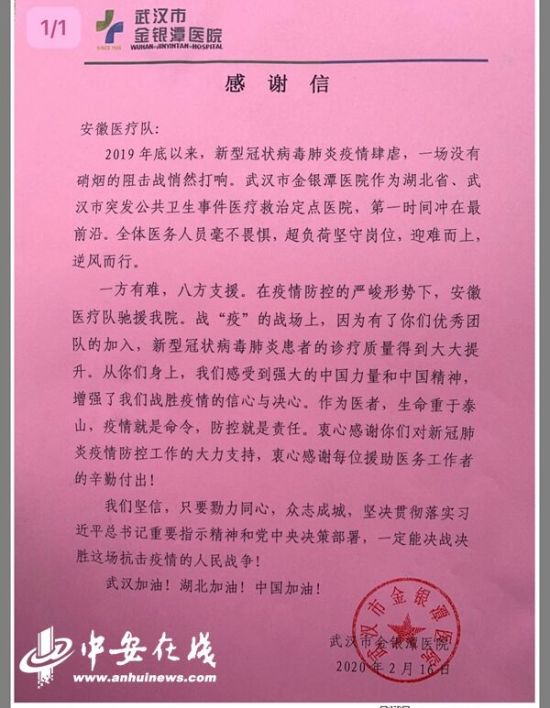 2月19日,记者从安徽省卫健委获悉,2月16日,武汉市金银潭医院向安徽医疗队发来感谢信,据了解,目前,安徽省支援湖北医疗队中有50名队员入驻金银潭医院重症病房,为新冠肺炎重症患者提供医疗服务。