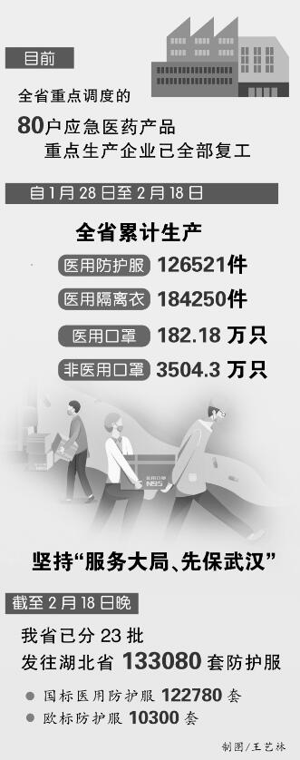 数据显示,自1月28日至2月18日,全省累计生产医用防护服126521件、医用隔离衣184250件、医用口罩182.18万只、非医用口罩3504.3万只。