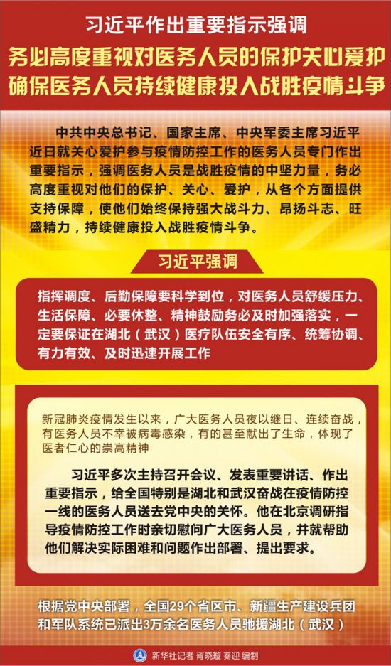 习近平强调,指挥调度、后勤保障要科学到位,对医务人员舒缓压力、生活保障、必要休整、精神鼓励务必及时加强落实,一定要保证在湖北(武汉)医疗队伍安全有序、统筹协调、有力有效、及时迅速开展工作。