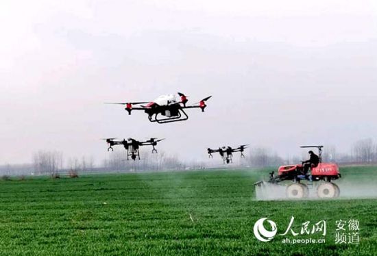 为抢抓农时,该县利用空中植保无人机、陆地自走植保机,对麦田进行陆空立体式管理,为午季小麦丰产丰收夯实基础,力争实现疫情防控与农业生产的“双赢”。