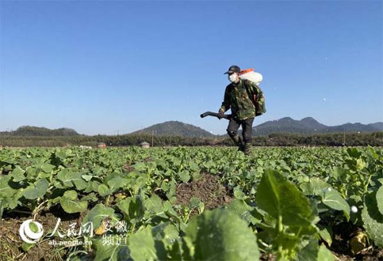 2月15日一大早,宁国市港口镇西村村的一处油菜田里,64岁的王大庆正戴着口罩背着喷肥机给油菜施肥,一桶50斤的肥料撒完,他的额头早已沁出了一层汗珠,“趁着这天好,给油菜施施肥,为丰产打基础。”