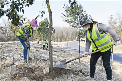2月20日,全椒县周岗村至西王镇22.5公里江淮分水岭国家风景道路工程造林项目上,工人们抢抓有利时机植树造林。