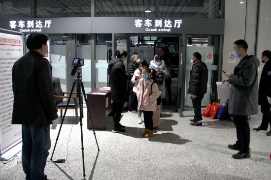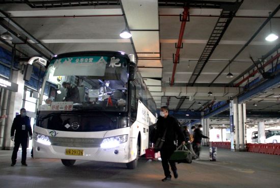 上午10点10分,20位乘客在合肥客运中心站工作人员验证返(来)肥旅客健康登记信息、体温检测合格后,踏向新的旅程。