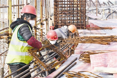 图为工人们正在忙着捆扎钢筋。记者计成军摄