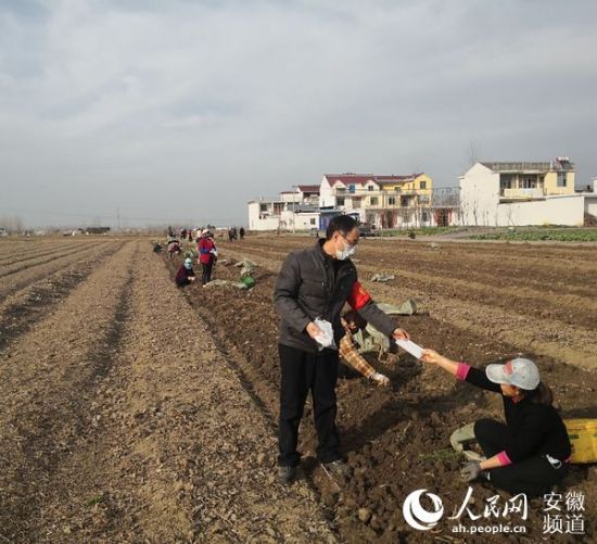 陈峰在中药材基地忙着给村民纷发口罩。马军武摄