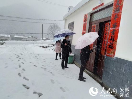 许秉飞(中)和扶贫工作队队员们冒雪挨家挨户走访防疫情况。金先锋摄