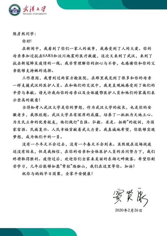 中安在线、安徽文明网、中安新闻客户端讯 “当得知考入武汉大学是你的梦想,作为武汉大学的校长,也是你的安徽老乡,我很欣慰……疫情过后,欢迎你们全家来美丽的东湖之畔做客,希望你刻苦学习,几年后能如愿‘常驻’珞珈山,我们在这里等你,加油!”2月26日,武汉大学校长窦贤康院士用信件方式,隔空“喊话”合肥四十五中7年级学生陈彦然同学,鼓励她刻苦学习,并祝愿其全家早日团聚,平安健康。