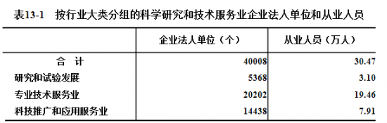 2018年末,全省共有科学研究和技术服务业法人单位41984个,从业人员33.91万人。其中,企业法人单位40008个,从业人员30.47万人,分别比2013年末增长305.3%和113.6%(详见表13-1)。