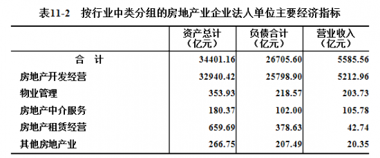 2018年末,全省房地产业企业法人单位的资产总计为34401.16亿元,比2013年末增长135.7%。其中,房地产开发企业32940.42亿元,物业管理企业353.93亿元,房地产中介服务企业180.37亿元,分别比2013年末增长138.4%,116%和140.8%。负债合计26705.6亿元。全年实现营业收入5585.56亿元(详见表11-2)。