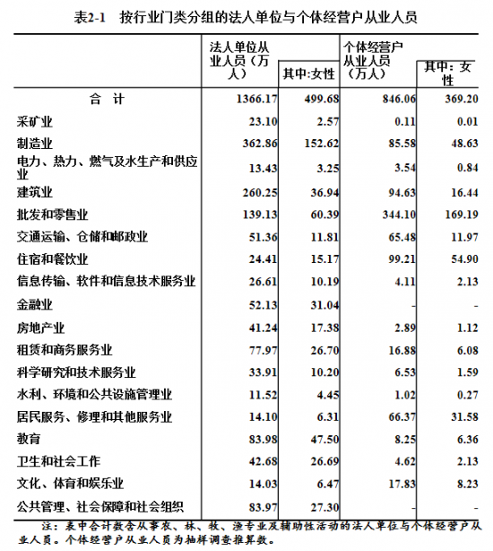 在法人单位从业人员中,位居前三位的行业是:制造业362.86万人,占26.6%;建筑业260.25万人,占19.1%;批发和零售业139.13万人,占10.2%。在个体经营户从业人员中,位居前三位的行业是:批发和零售业344.1万人,占40.7%;住宿和餐饮业99.21万人,占11.7%;建筑业94.63万人,占11.2%(详见表2-1)。
