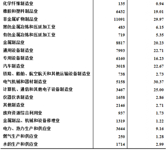 在工业企业法人单位从业人员中,采矿业占5.8%,制造业占90.8%,电力、热力、燃气及水生产和供应业占3.4%。在工业行业大类中,纺织服装服饰业、电气机械和器材制造业、非金属矿物制品业从业人员数位居前三位,分别占8.5%、7.6%和7.5%(详见表4-1)。