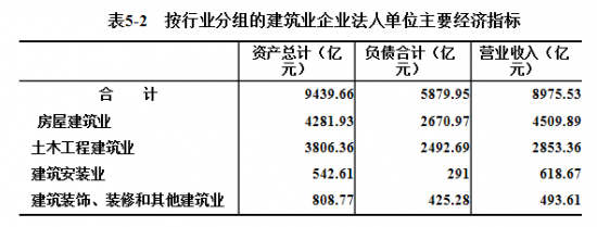 2018年末,建筑业企业法人单位资产总计9439.66亿元,比2013年末增长105.5%。负债合计5879.95亿元。全年实现营业收入8975.53亿元(详见表5-2)。