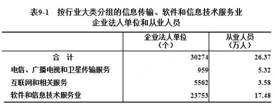 2018年末,全省共有信息传输、软件和信息技术服务业企业法人单位30274个,从业人员26.37万人,分别比2013年末增长407.3%和153.6 %(详见表9-1)。