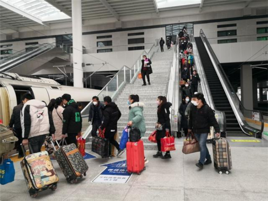 2月28日晚,G7795次复工定制专列准时到达铁路台州站。这趟列车从安徽阜阳始发,沿途载上了860名多务工人员,奔赴台州291家企业返岗复工。这也是长三角铁路开行的第100趟复工定制专列。