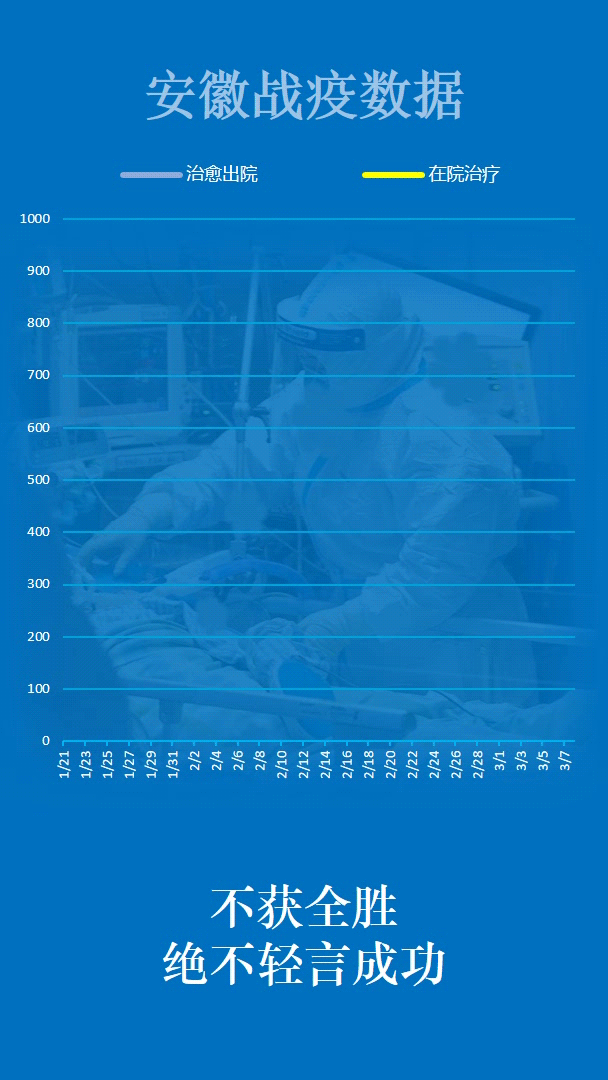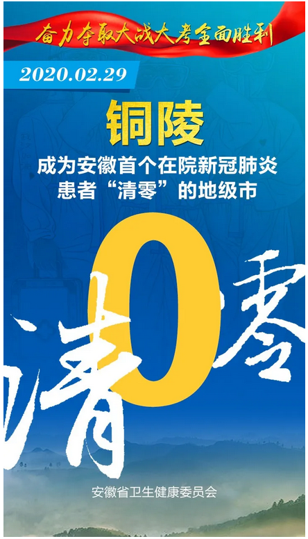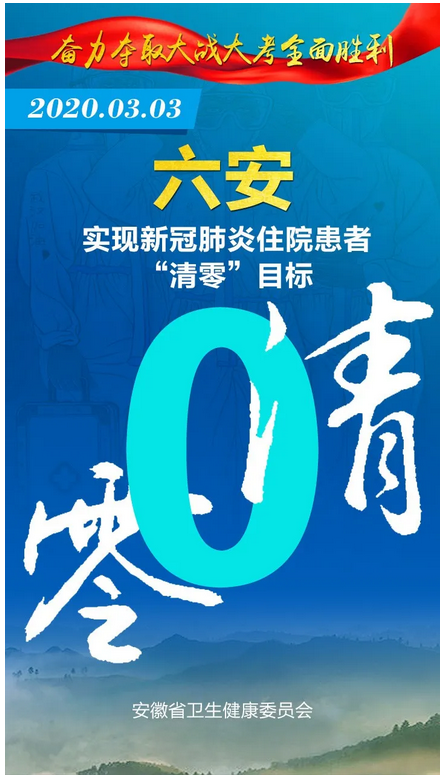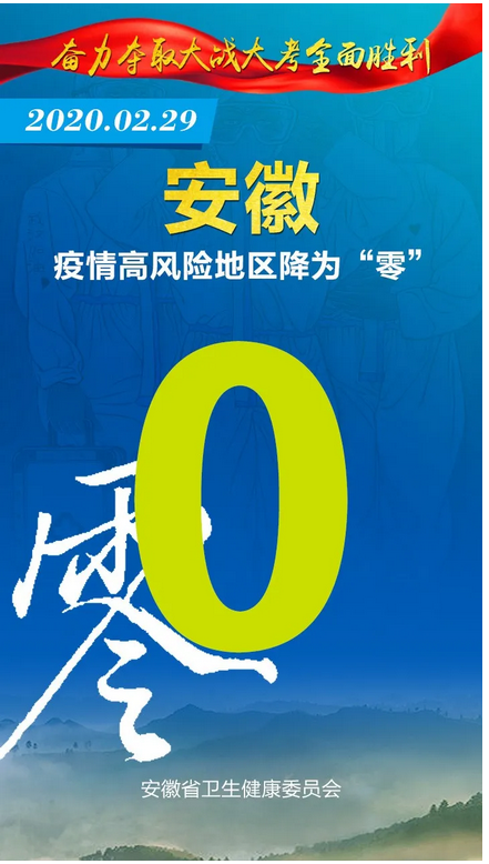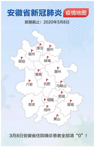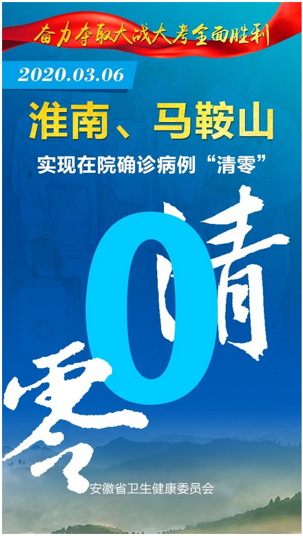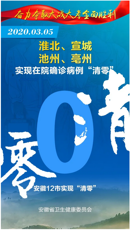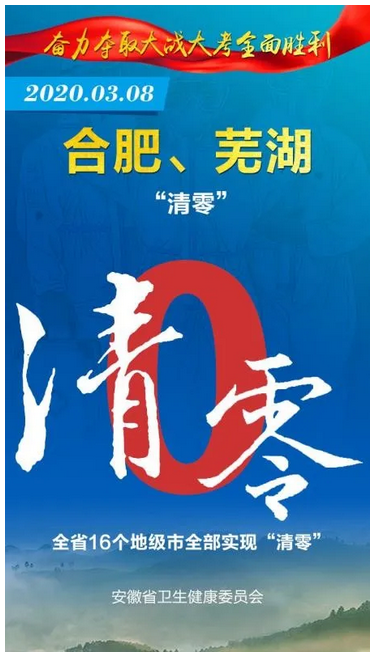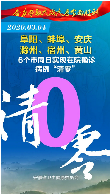见证安徽“零”时刻 2020-03-08 16:14 健康安徽HealthyAnhui 扫描到手持设备 字号: 3月8日,随着安徽省最后一例在院新冠肺炎确诊病例治愈出院,安徽省984例确诊住院病例全部出院,全省16个市实现“清零”,治愈率达99.4%。 截至目前,安徽省已连续9天无新增确诊病例、新增疑似病例。 来,一起见证属于安徽的这些“零”时刻! 复制网址 打印 收藏 关于我们 | 联系我们 | 加入我们 | 版权声明 | 手机访问 | 网站地图 | 留言反馈 | 我要投稿 中共滁州市委宣传部主办 滁州日报社承办 Copyright?2009-2010 Chuzhou.cn. All Rights Reserved 滁州日报社 版权所有 皖网宣备3412015001号 皖ICP备11004325号-1 热线电话:0550-3022685