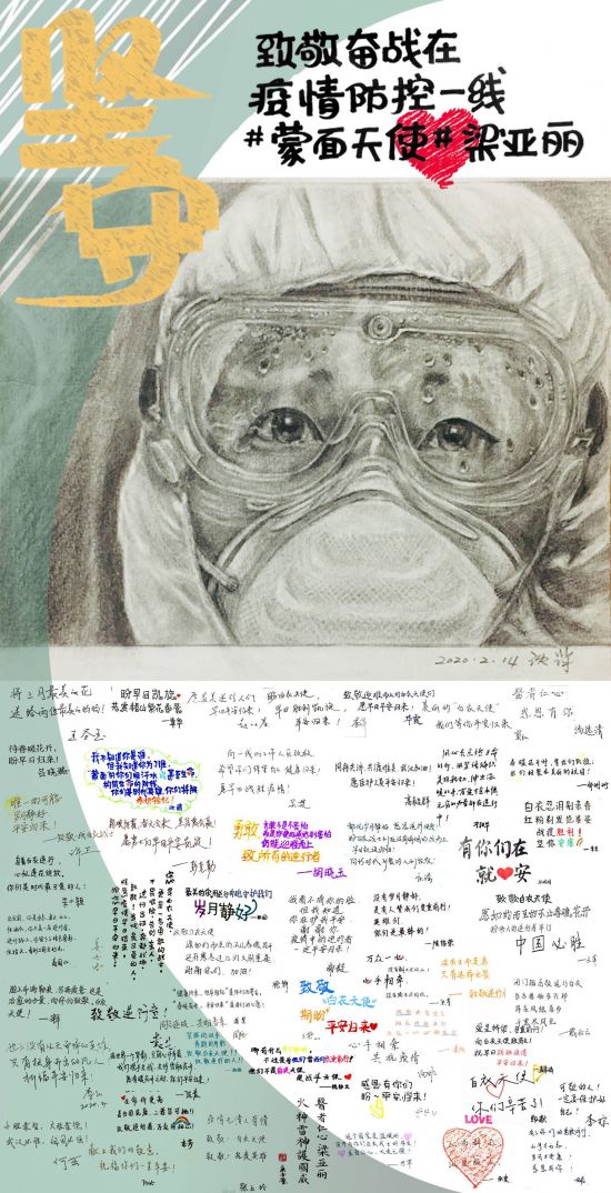 据了解,葛金菱的儿子在实验幼儿园上学,当了解到学生家长在武汉一线奋战,为了给他们加油打气,老师沈翡和董招娣以画为援,致敬最美的逆行者。在作品的下方,全体老师们也为葛金菱和梁亚丽写下了最真挚的祝福。