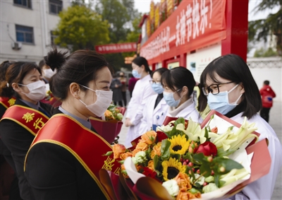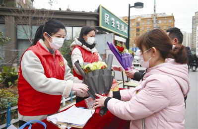 3月8日,南谯区银西社区泰行物业公司党支部的女志愿者将鲜花送给参加抗击新冠肺炎疫情的女医护人员,感谢她们在抗“疫”一线的艰辛付出。当日虽然是休息日,但是依然有许多女同胞们坚守岗位一线,度过自己的节日。