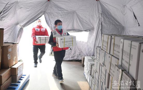 3月7日,在安徽省红十字会备灾救灾中心,“00后”孟洋铎与志愿者们一起搬运整理物资。