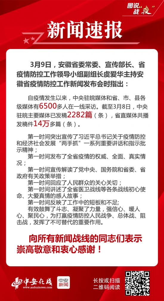 截止3月8日,中央驻皖主要媒体已发稿2282篇(条),省直媒体共播发稿件14万多篇(条),第一时间突出宣传了习近平总书记关于疫情防控和经济社会发展“两手抓”一系列重要讲话和指示批示精神,第一时间发布了全省疫情的权威、全面、真实情况,第一时间宣传解读了党中央、国务院和省委、省政府有关政策举措,第一时间回应了人民群众的关心关切,第一时间讲述了全省医卫战线等各条战线初心使命、大爱真情的感人故事,第一时间反映了工作中的短板和不足,有效鼓舞了斗志、凝聚了力量,强信心、暖人心、聚民心,为打赢疫情防控人民战争、总体战、阻击战,发挥了不可替代的重要作用。