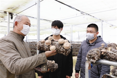 位于马厂镇复兴村的全椒县环正红农业科技公司主要种植销售薄壳山核桃、香菇,目前已全面复工复产。图为公司技术人员探讨研究香菇的出菇率、菇型及饱满程度。