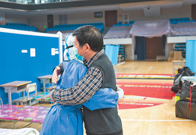10日,武昌方舱医院休舱在即,患者和照顾他的医务人员紧紧拥抱。