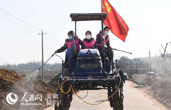 六安市裕安区战疫“红色娘子军”对出现确诊病例区域周围的村道消毒。陈力摄