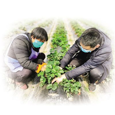 冯克超(右)和贫困户梅友芝一起摘除草莓的老叶、病叶。资料图片