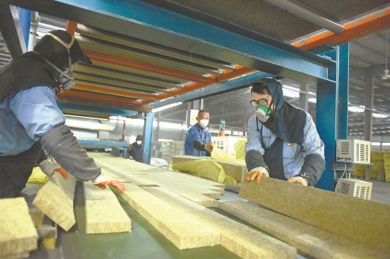 近日,位于滁州市南谯经济开发区的安徽瑞联节能科技有限公司,职工在生产出口的无饰岩棉带保温复合板。本报通讯员 董超 摄