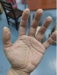 安医大一附院援鄂医疗队队员陈红,双手因长期被消毒液、洗手液等浸泡侵蚀,长满了裂口。(右图)