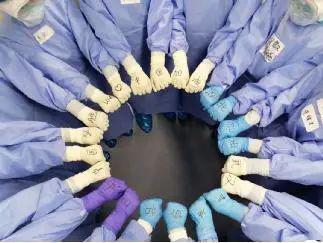 连续工作8小时,中国科大附一院(安徽省立医院)援鄂医疗队队员樊华手掌被汗水泡皱。(左图)