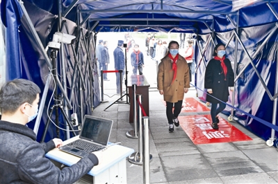 4月1日,滁州市二小,由教师扮演的学生队伍排队通过测温区进入校园。