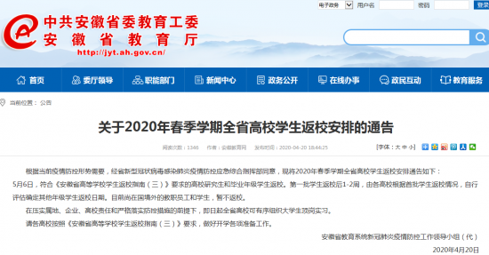 4月20日,安徽省教育厅发布关于2020年春季学期全省高校学生返校安排的通告,根据当前疫情防控形势需要,5月6日,符合《安徽省高等学校学生返校指南(三)》要求的高校研究生和毕业年级学生可以率先返校。