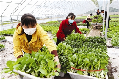 4月21日下午,南谯区汪郢村现代农业示范园有机蔬菜种植基地大棚内,工人们在搬运发往南京市场的新鲜有机蔬菜。