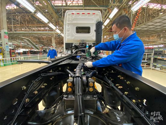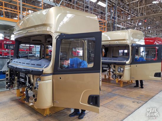 △陕汽总装车间内一片繁忙景象。(总台央视记者杨立峰、彭汉明拍摄)