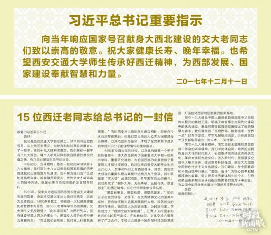 当年给总书记写信的15位西迁老教授已有一人辞世。22日下午,习近平亲切会见了健在的14位西迁老教授。总书记说,从黄浦江畔搬到渭水之滨,你们打起背包就出发,舍小家顾大家。交大西迁对整个国家和民族来讲、对西部发展战略布局来讲,意义都十分重大。