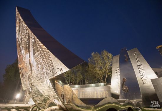 △这是西安交大名为“交通大学西行之履”的主题雕塑。夜晚时分,主题雕塑上会有八个脚印依次亮起,象征西行的脚步一个一个迈进。