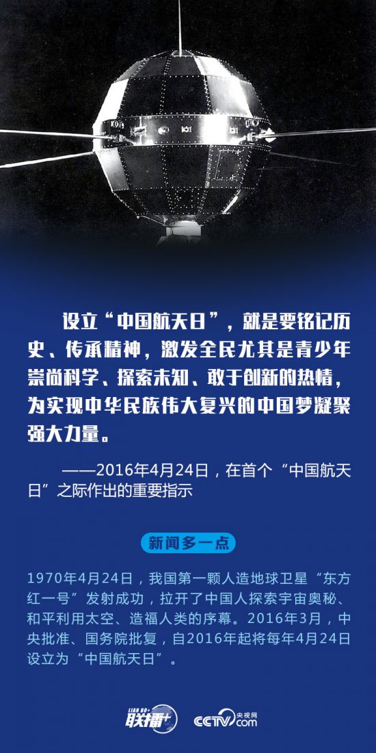 联播+4月24日是中国航天日。1970年4月24日,我国第一颗人造地球卫星“东方红一号”发射成功,拉开了中国人探索宇宙奥秘、和平利用太空、造福人类的序幕。