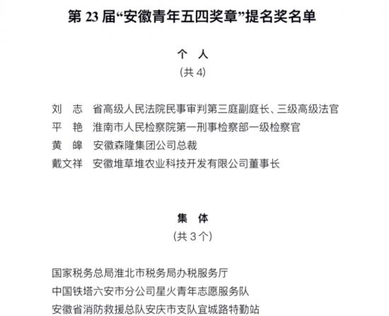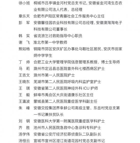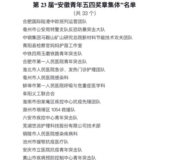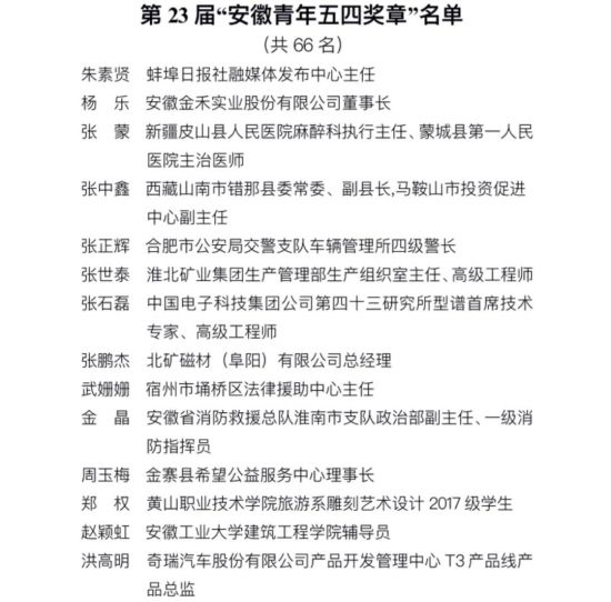 为表彰我省优秀青年在社会经济发展和新冠肺炎疫情防控中的杰出贡献,集中展示新时代安徽青年的精神品格和价值追求,激励全省广大青年担当作为,攻坚克难,为建设现代化五大发展美好安徽、实现“两个一百年”奋斗目标、实现中华民族伟大复兴的中国梦而不懈奋斗,经评审会评审,共青团安徽省委、安徽省青联决定,授予朱素贤等66名个人为第23届“安徽青年五四奖章”,亳州市公安局特警支队反恐防暴突击大队等33个集体为第23届“安徽青年五四奖章集体”;追授胡锋同志为“安徽青年五四奖章”。同时,刘志等4名个人、安徽省消防救援总队安庆市支队宜城路特勤站等3个集体评为第23届“安徽青年五四奖章(集体)”提名奖。