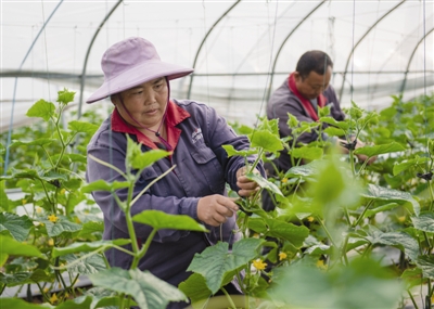 “五一”期间,来安县各行各业抢抓时间忙生产。图为在舜山镇六郎村蔬菜大棚内,农户正在采摘山芋苗。特约摄影吕 华摄