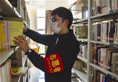 为使读者在“五一”假期享受阅读的乐趣,明光市图书馆在做好疫情防控工作的同时,积极采购新书上架,同时组织志愿者为读者做好服务。图为大学生志愿者华君杰在阅览室内整理刚上架的新书。 特约摄影王绪波摄