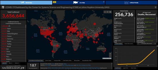 人民网北京5月6日电(冯粒)据美国约翰斯·霍普金斯大学最新发布的新冠肺炎疫情统计数据,截至北京时间5月6日6时59分,美国累计确诊病例已经超过120万例,为1202246例。全球确诊病例人数为3656644,这意味着美国累计确诊病例已占据全球确诊病例的三分之一。
