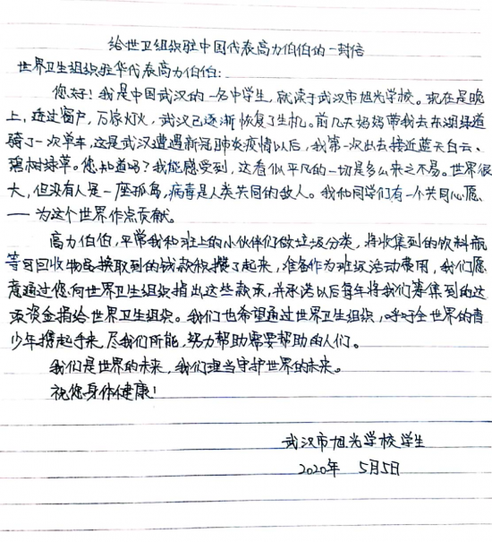 人民网北京5月7日电 据湖北广播电视台APP“长江云”消息,近日,中国武汉的一名中学生给世卫组织驻中国代表高力写信,表示愿意将班级活动费用捐赠给世卫组织,并希望通过世卫组织呼吁全世界的青少年携起手来,努力帮助需要帮助的人们。