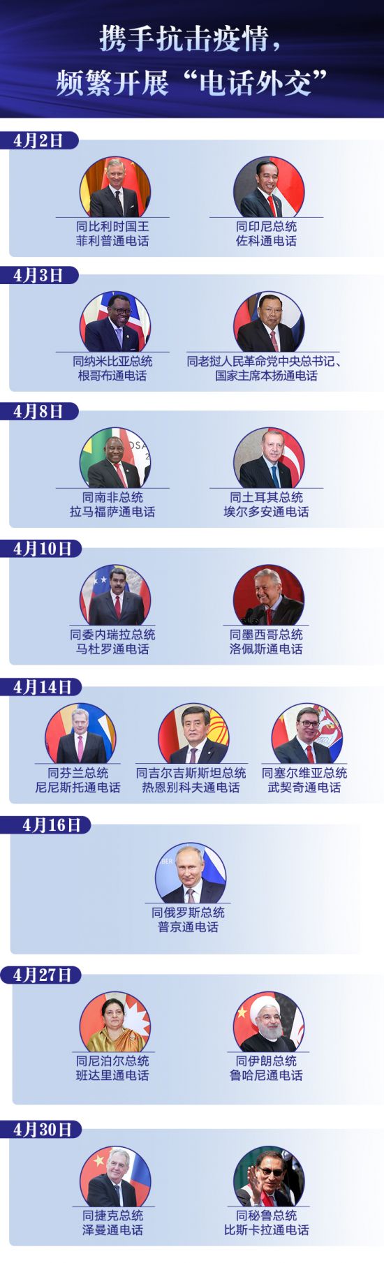 病毒没有国界,不分种族,是全人类面临的共同挑战,国际社会只有形成合力,才能战而胜之。4月,习近平还同比利时、南非、俄罗斯等18位国家领导人通电通信,秉持人类命运共同体理念,表达加强团结协作,携手抗击疫情,共同维护世界公共卫生安全的中国主张。