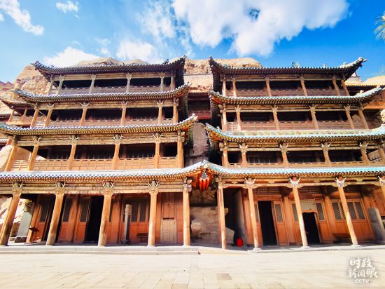 △第5、6窟是工程浩大、雕饰华丽的典型洞窟。窟前四层木质楼阁为清顺治八年(1651年)所建。第5窟主像是云冈石窟第一大佛,坐佛高17米。(总台央视记者李辉、杨波拍摄)
