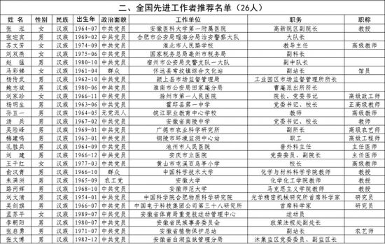 党中央、国务院决定,2020年评选表彰全国劳动模范和先进工作者。根据《中共安徽省委办公厅 安徽省人民政府办公厅关于做好2020年全国劳动模范和先进工作者评选推荐工作的通知》(皖办明电〔2020〕4号)精神,我省各地区、各部门、各单位认真开展全国劳动模范和先进工作者候选人推荐工作。经省推荐评选工作领导小组审议,并报全国筹委会办公室初审,现将84名安徽省2020年全国劳动模范和先进工作者推荐人选名单予以公示。为广泛征求意见,接受监督,自公示之日起,如有异议请于5月21日前以电话、传真、电子邮件或来信来访的方式进行反映,提倡实名反映问题。反映问题须实事求是,客观公正。请提供联系方式、具体事实和线索以便调查。对反映问题者以及反映的问题,将严格保密。